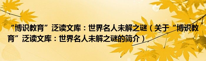 大家好,很多人对“博识教育”泛读文库:世界名人未解之谜,关于“博识教育”泛读文库:世界名人未解之谜的简介这个还不是很了解,现在让我们一起来看看吧!